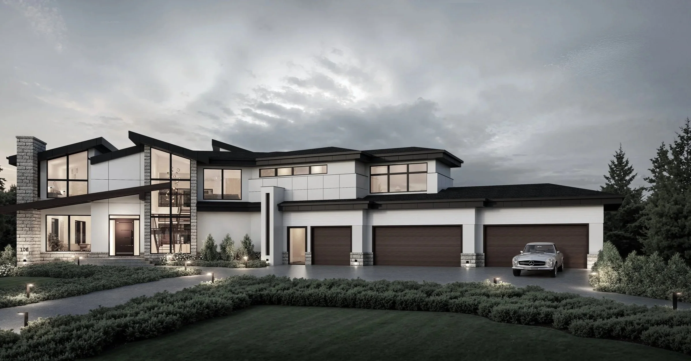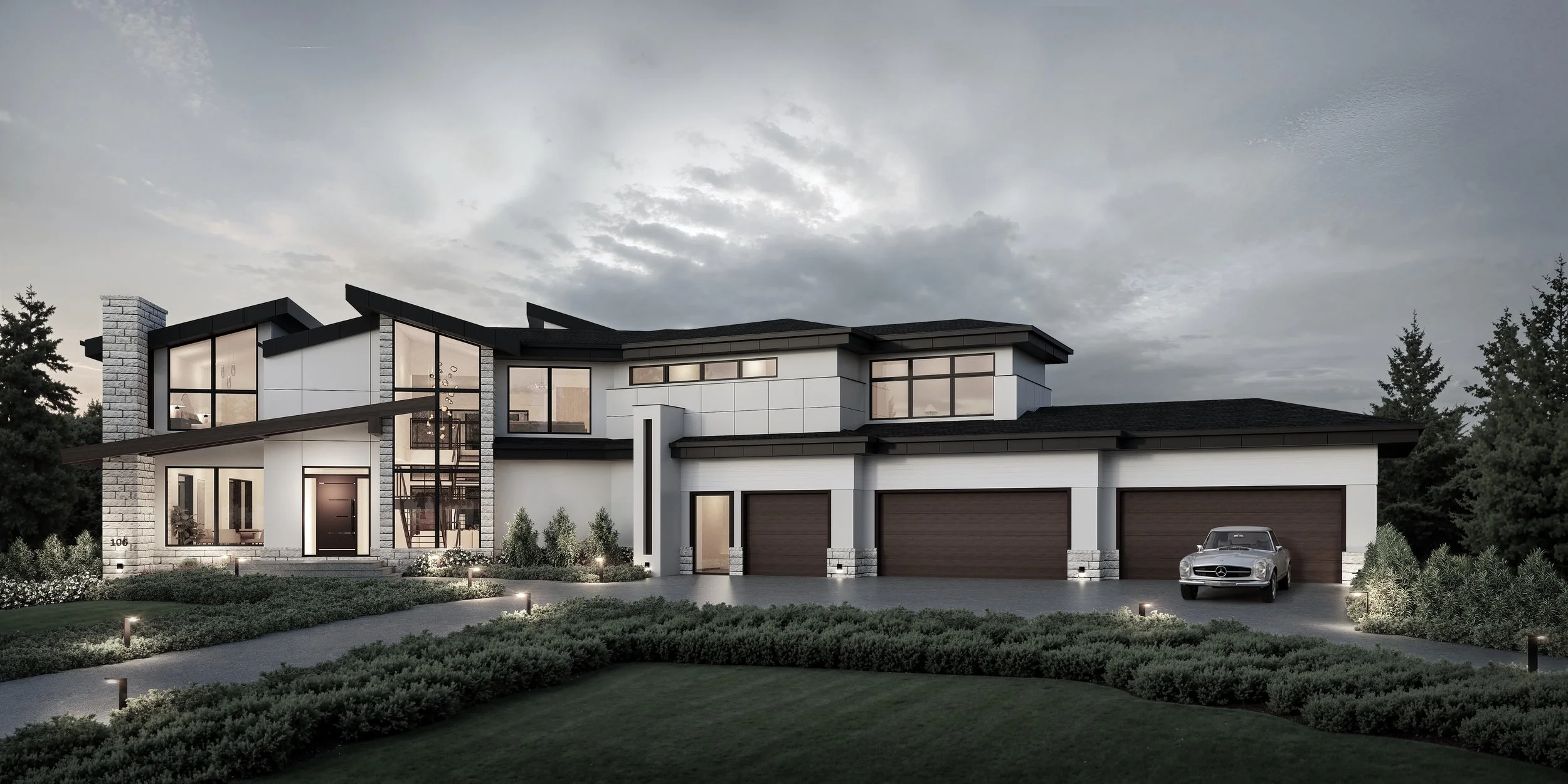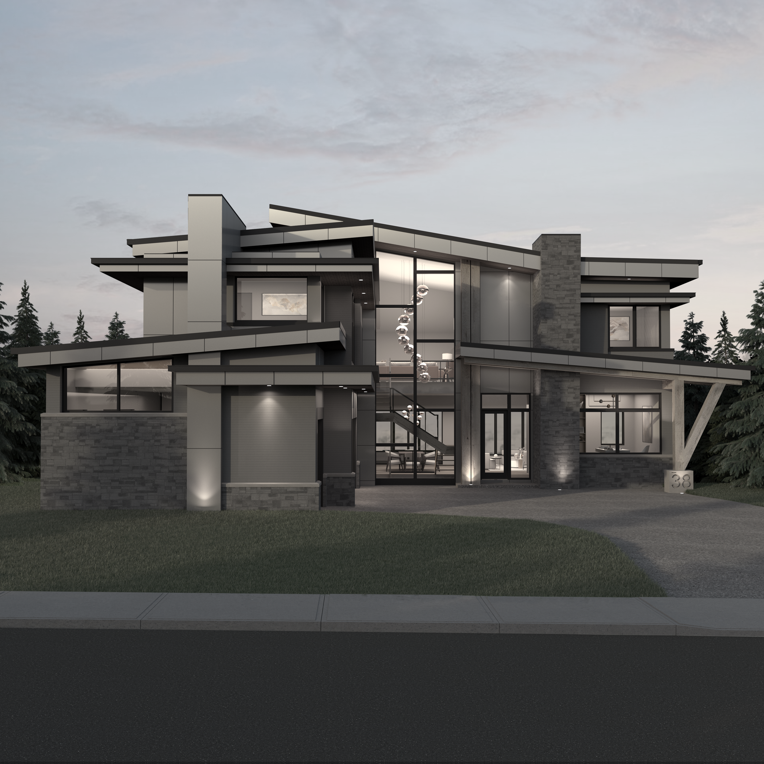 This West Coast Contemporary residence embodies modern architectural expression in a bold, sculptural form. The dramatic butterfly roof and soaring stone massing walls, which extend from the ground plane past the roofline, create a powerful street presence. An L-shaped footprint with a front side-drive garage organizes the plan, while the sculptural staircase displayed behind two-and-a-half-storey vaulted glass defines the front elevation as the home’s architectural centerpiece.