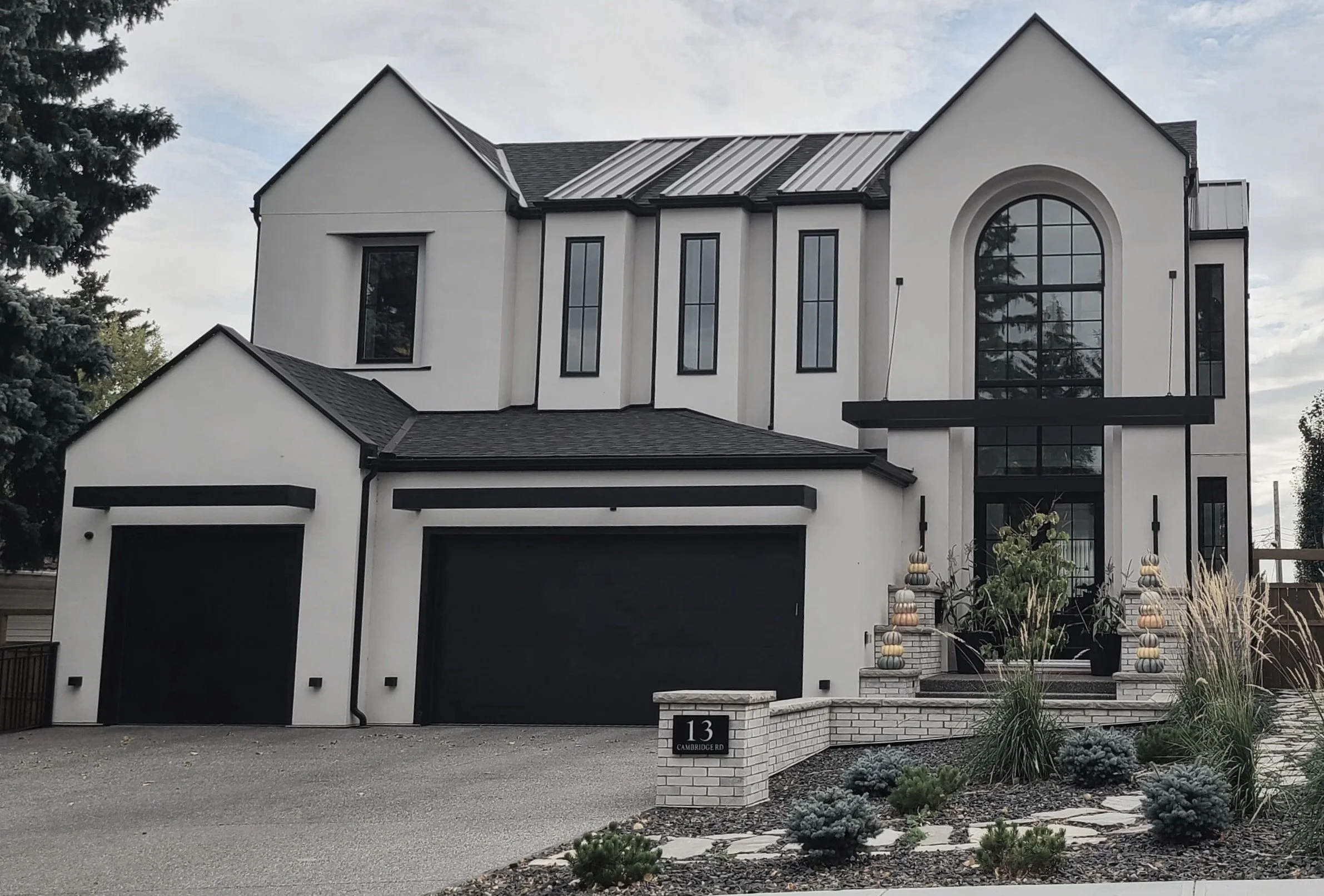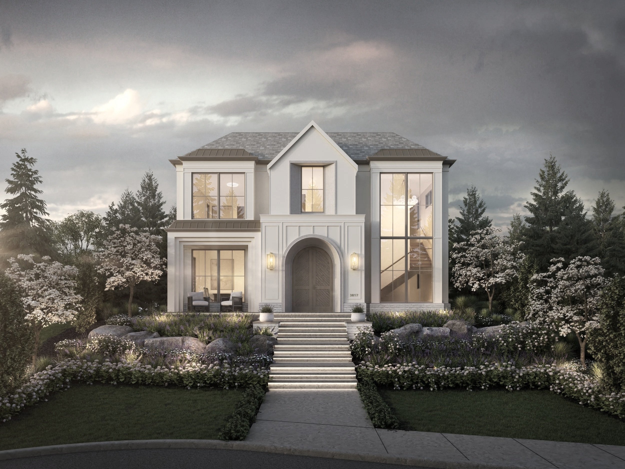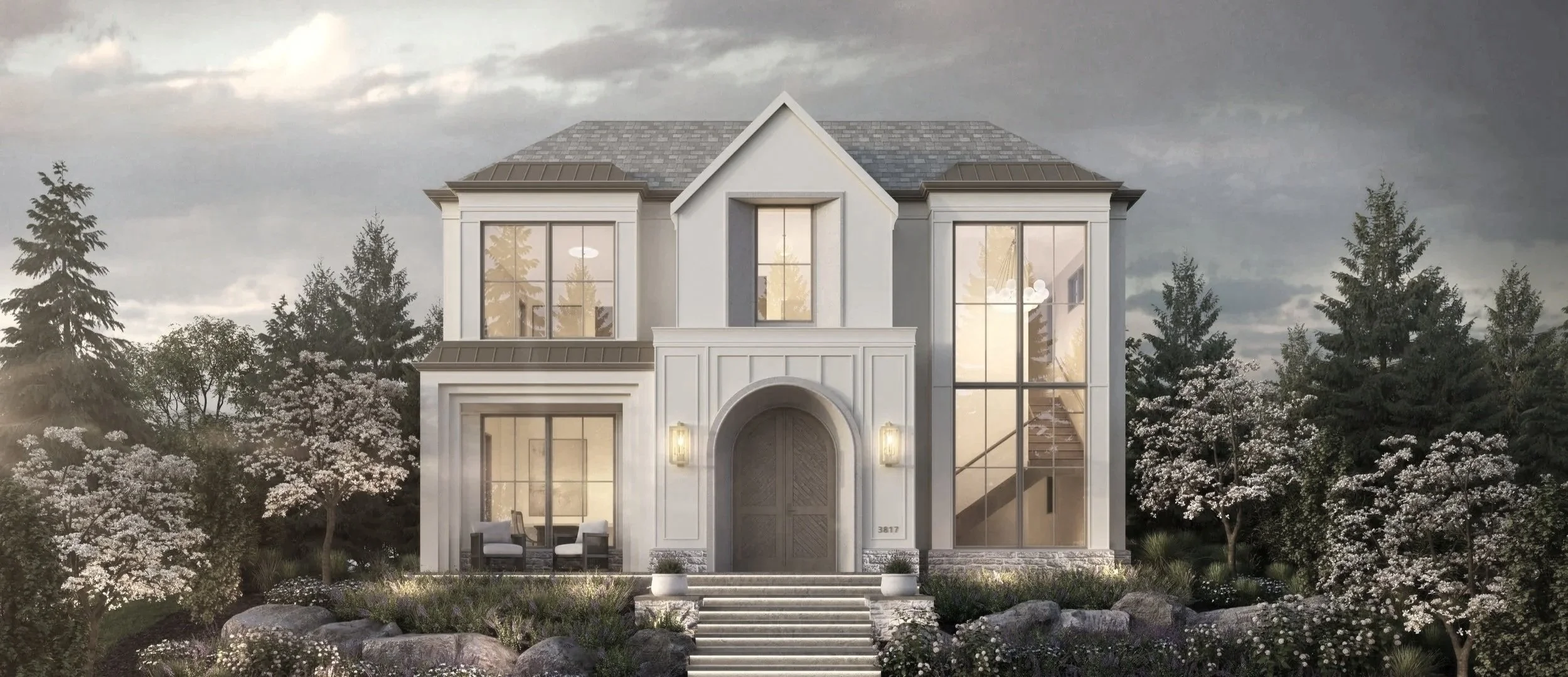 A 5,700 SF modern-classical semi-detached development comprising two luxury residences with attached double garages, set to break ground in South Calgary.