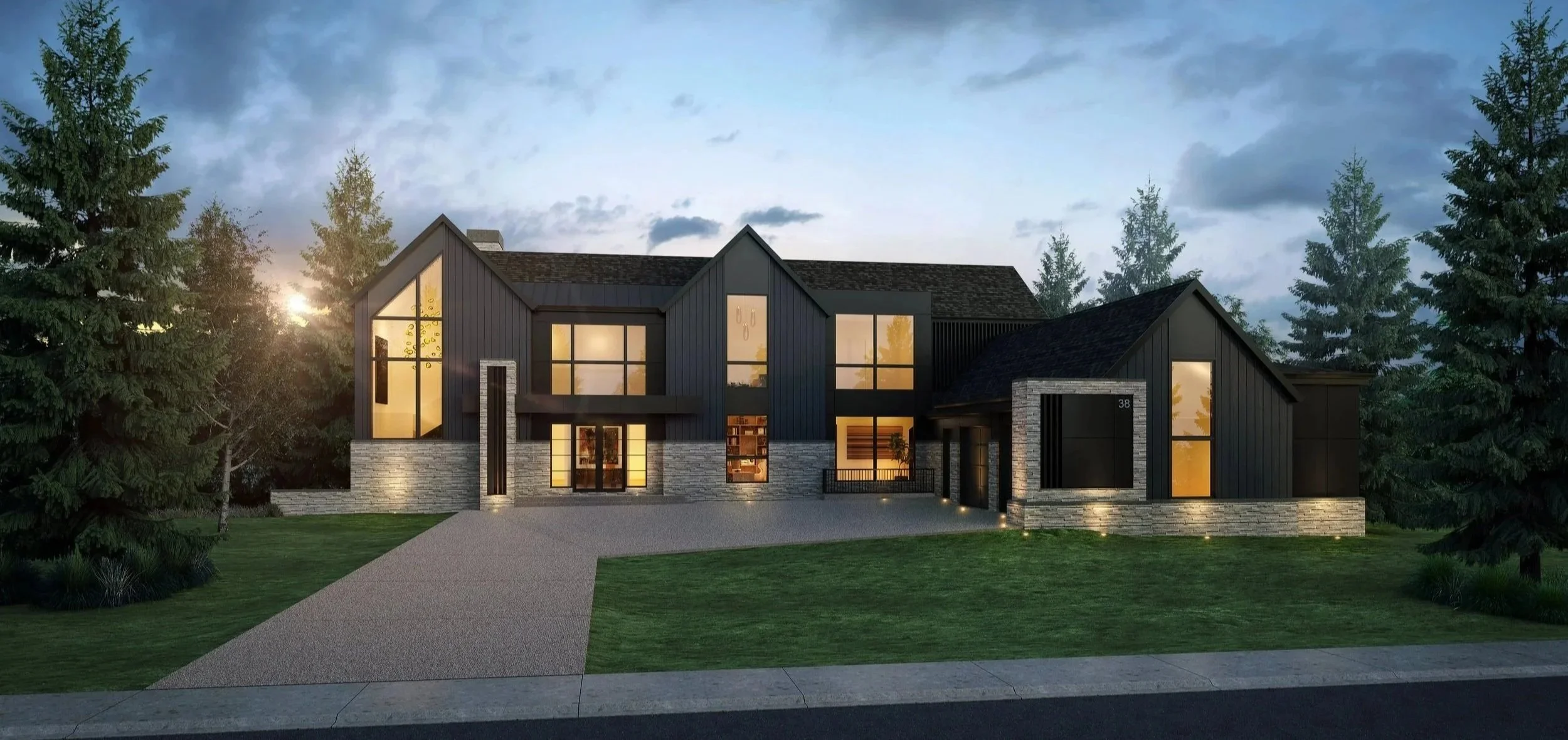 A bold interpretation of Scandinavian design, the exterior is clad in black Hardie vertical Artisan siding with black asphalt and standing seam metal roofing. The staircase is framed by raked windows that trace the roof pitch and anchor a chandelier as a focal point, while the basement integrates a half basketball court as a distinctive recreational space within the home.